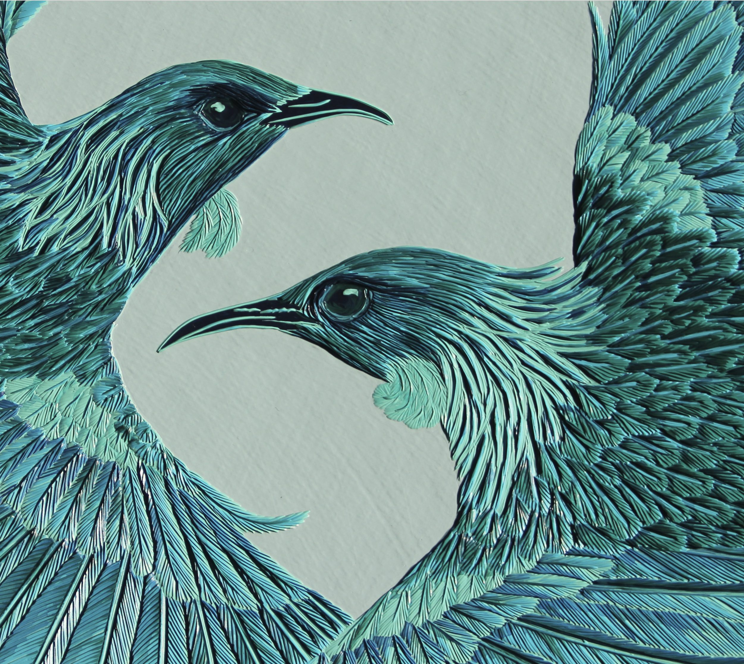 Created in 2020 on a 600mm round board, this dancing Tūī duo was carved into 79 layers of acrylic paint.
